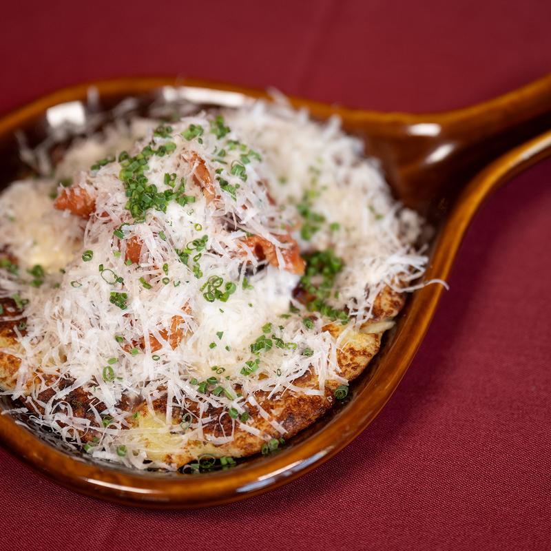Shallow-fried Potato Pancakes | Aged White Cheddar | Table Cream | Fried Pancetta | Lingonberries Jam